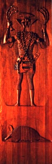 com grande quantidade de búzios, contas de coral e plumagem de caça. Ele concede abundância, bem como o tesouro do